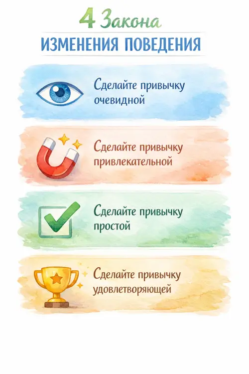 Дальше в книге эта модель превращается в 4 закона изменения поведения — практический инструмент, который показывает, что именно делать с каждым этапом.