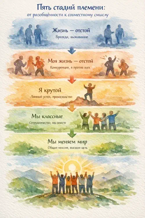 Книга «Лидер и племя» рассматривает лидерство не как набор личных качеств руководителя, а как управление уровнем культуры группы. Авторы показывают, что люди всегда объединяются в «племена» — неформальные сообщества со своими ценностями, языком и правилами.