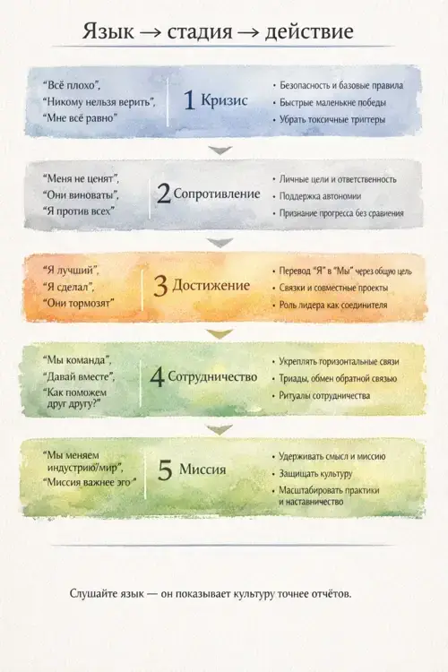 Если между людьми нет минимального уровня психологической безопасности, любые разговоры о “мы” воспринимаются как фальшь. В такой ситуации попытки внедрить высокие стадии приводят к сопротивлению или цинизму, потому что люди не готовы открыто взаимодействовать. Сначала требуется восстановить доверие через простые договорённости и предсказуемость, и только потом работать с культурой.